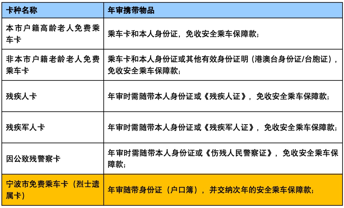需年审的免费公交卡包含高龄白叟免费搭车卡和爱心卡(残疾人、残疾武士、因公致残差人)、宁波市免费搭车卡(勇士遗属免费搭车卡)和离休干部免费搭车卡等。
